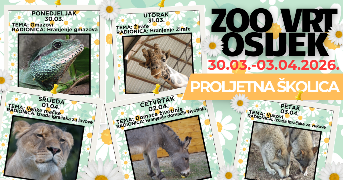 ZOO vrt Osijek Tvrđavica 263, Osijek"Dragi roditelji i mali istraživači, zbog loših vremenskih prilika otkazujemo Proljetnu školicu u ZOO vrtu. Znamo da ste se veselili, ali sigurnost i ugoda su nam na prvom mjestu. Hvala na razumijevanju!", izvijestili su ove nedjelje iz ZOO. ZOO vrt Osijek poziva djecu na edukativni program Proljetne škole u ZOO vrtu Osijek. Kroz igru, radionice […]