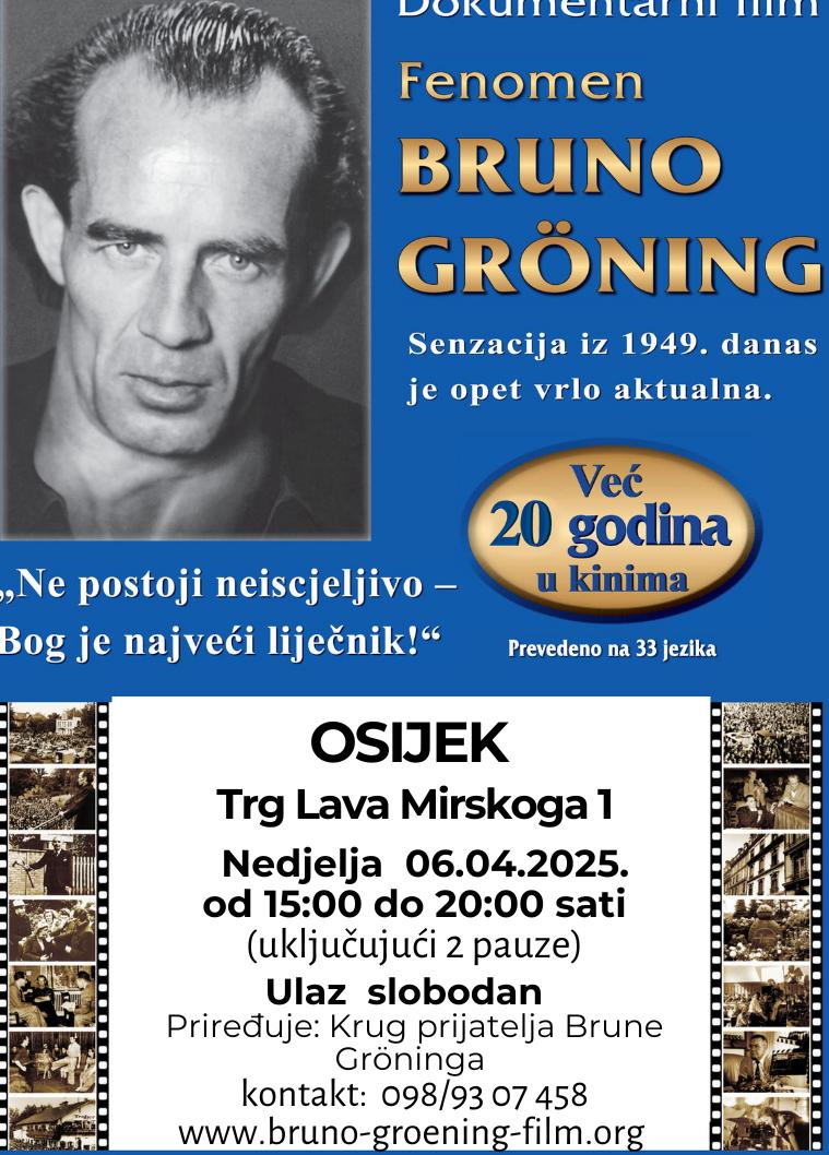 U Nedjelju 6.4.2025. u Velikoj dvorani Gradske četvrti Gornji grad, Trg Lava Mirskog 1, s početkom u 15.00h, u organizaciji Kruga prijatelja Brune Groeninga bit će prikazan film Fenomen Bruno Groening. Ulaz za sve zainteresirane je slobodan.