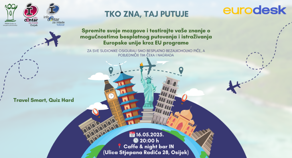 PRONI centar za socijalno podučavanje poziva ljubitelje znanja, zabave i putovanja na „Tko zna, taj putuje”, pub kviz koji će se održati u petak, 16. svibnja s početkom u 20 sati, u Caffe & night baru IN (Ulica Stjepana Radića 28, Osijek). Danas mladi imaju puno prilika za putovanja i istraživanje Europe. Postoje razni programi […]