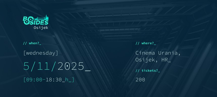 Neovisna konferencija BSides vraća se u Osijek 5. studenog 2025., i to u prostor Kina Urania. Ovaj community-driven InfoSec event, koji se tradicionalno održava svake dvije godine, okuplja stručnjake, istraživače, etičke hakere i sve zaljubljenike u sigurnost sustava, mreža i podataka. BSides konferencije globalno su poznate po otvorenoj i neformalnoj atmosferi, gdje nema korporativnih zidova, […]