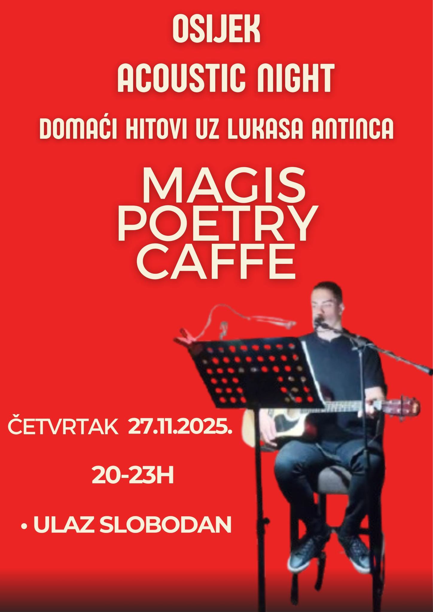 Ovog četvrtka priuštite sebi savršenu večer za opuštanje! Pridružite se na Acoustic Night-u u čarobnom ambijentu Poetry Caffe Magis, gdje nas očekuje samo najbolji zvuk i energija! A Lukas Antinac je tu da vas provede kroz najveće domaće hitove koje svi volimo. Zapjevajte s njima, opustite dušu i uživajte u svakom taktu!