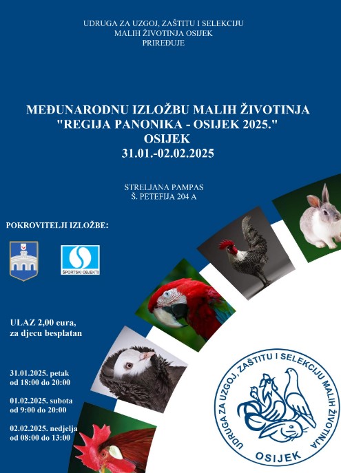 Udruga za uzgoj, zaštitu i selekciju malih životinja Osijek organizira Međunarodnu izložbu malih životinja “Regija Panonika – Osijek 2025” koja će biti održana od 31. siječnja do 2. veljače u prostoru osječke Streljane Pampas.