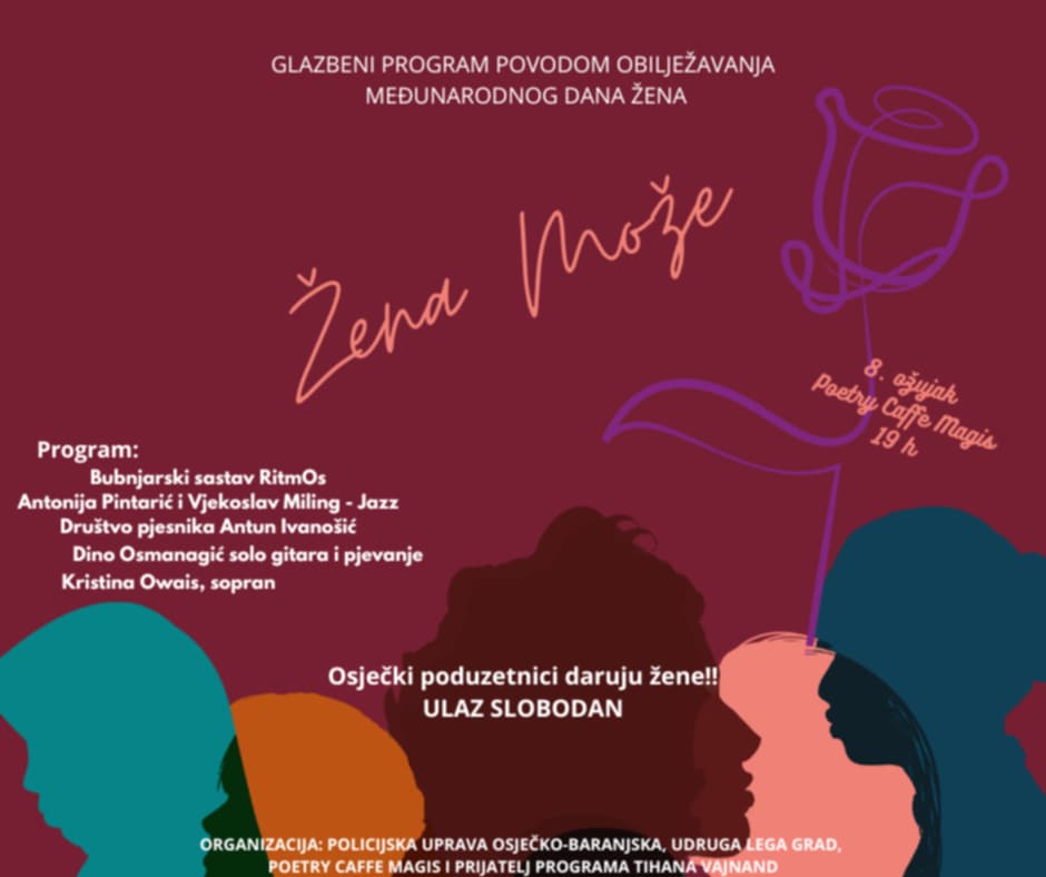 Kao i svake godine, povodom obilježavanja Međunarodnoga dana žena, četrnaestu godinu zaredom održat će se glazbeno-scenski program pod nazivom “Žena može“, projekt u sklopu Nacionalnog preventivnog projekta “Živim život bez nasilja“. Događanje upriličit će se danas u 19 sati u Poetry caffe Magis.