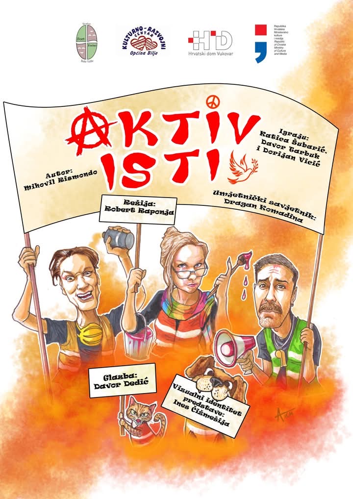 Predstava “Aktivisti“ Mihovila Rismonda u režiji Roberta Raponje nova je koprodukcija Teatra Fort Forno iz Bala, Kulturno-razvojnog centra Općine Bilje i Hrvatskoga doma Vukovar.