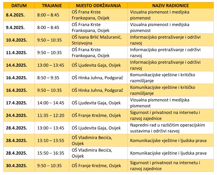 Provedba radionica počinje već u travnju, a svaka radionica trajat će 45 minuta. Sudjelovanje je na radionicama besplatno.
