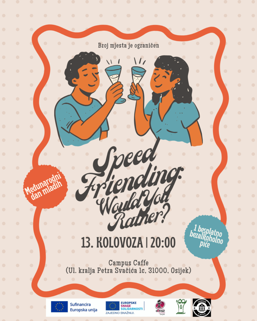 U povodu Međunarodnog dana mladih, PRONI centar za socijalno podučavanje poziva te na Speed Friending: Would You Rather, koji će se održati u srijedu, 13. kolovoza s početkom u 20 sati, u Campus Caffe-u (Ul. kralja Petra Svačića 1c, 31000, Osijek).