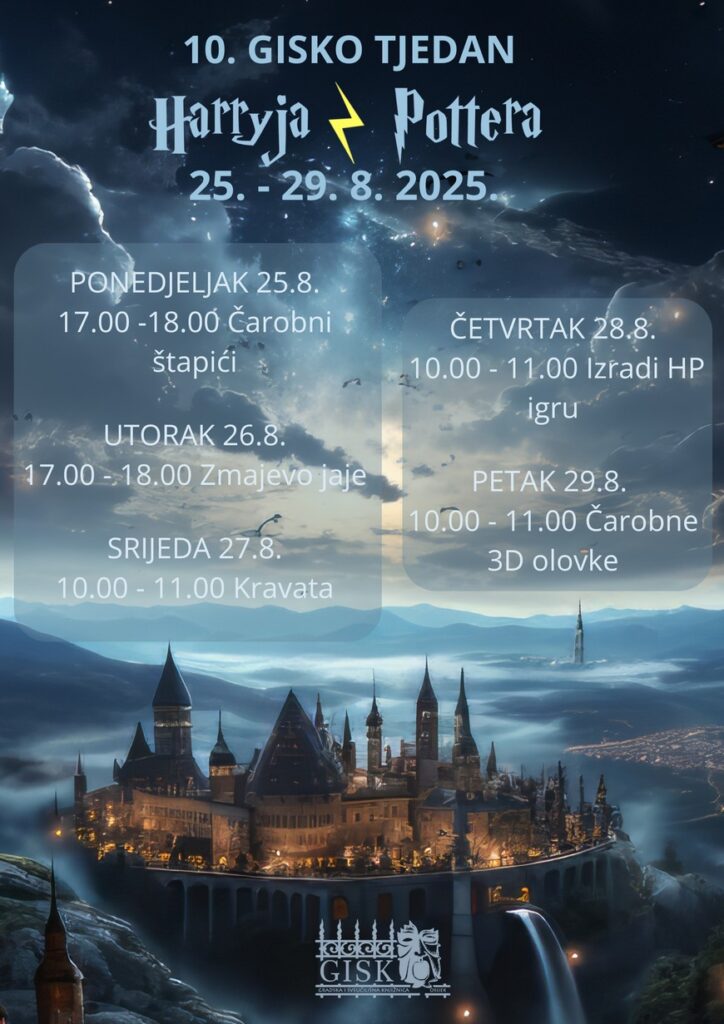Gradska i sveučilišna knjižnica Osijek organizira deseti po redu GISKO tjedan Harryja Pottera. Ova čarobna manifestacija održat će se od 25. do 29. kolovoza 2025. godine, a kao i svaki put dosad, namijenjena je svim čarobnjacima i bezjacima u dobi od 9 do 99 godina.