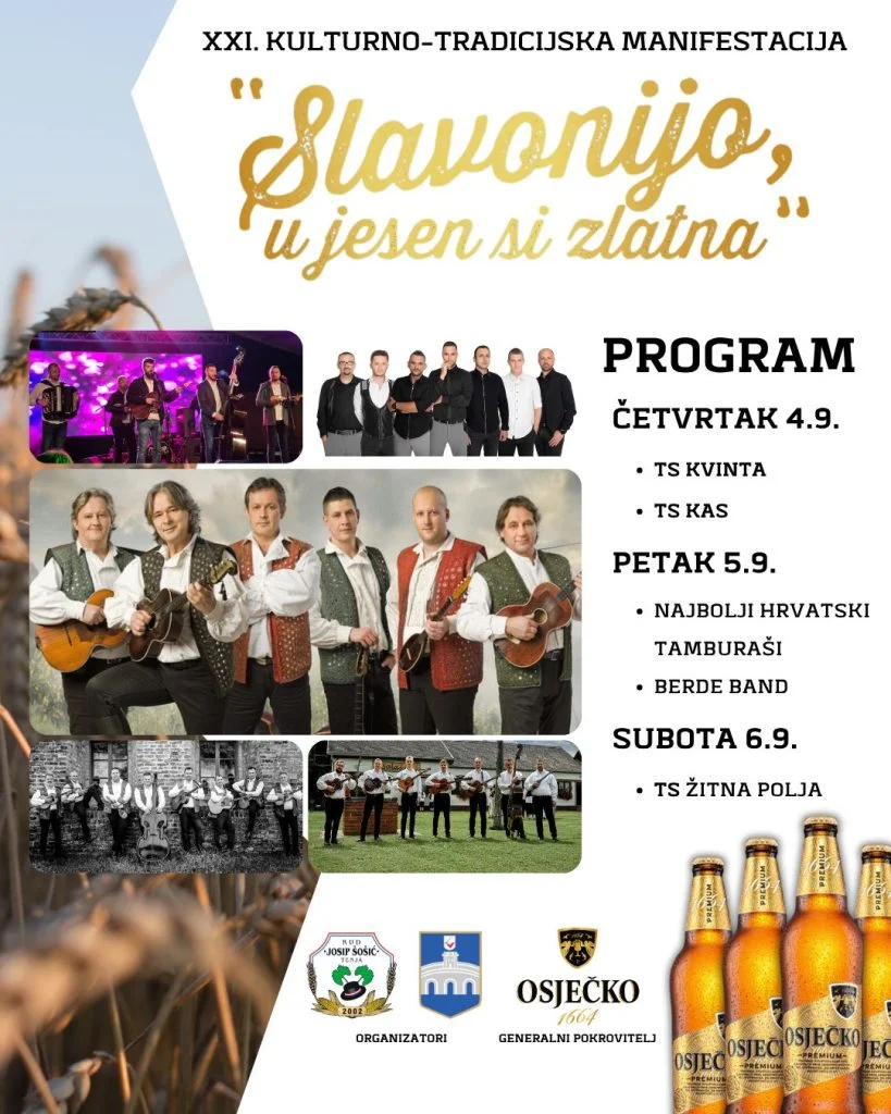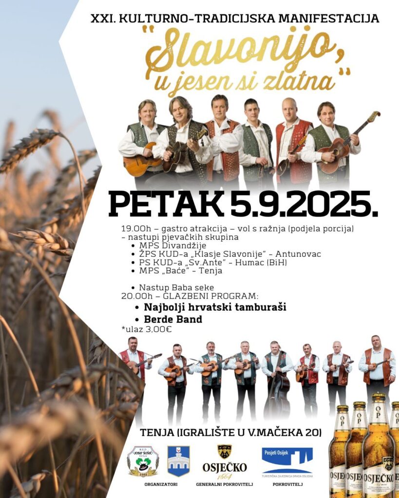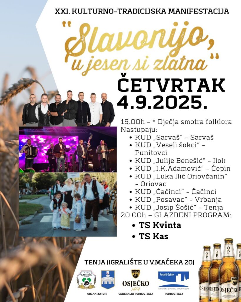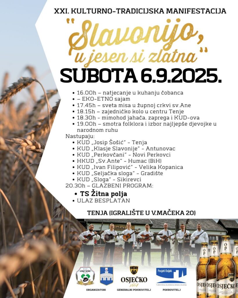 Krajem ljeta Tenja kraj Osijeka postaje središte slavonske tradicije kroz 21. po redu manifestaciju “Slavonijo u jesen si zlatna”, od 4. do 6. rujna 2025.
