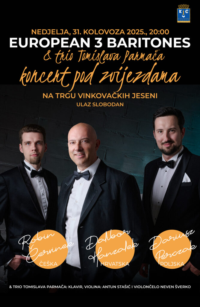 Vinkovci će posljednju kolovošku večer pamtiti po posebnom glazbenom doživljaju. Na novootvorenom Trgu Vinkovačkih jeseni, mjestu koje već sada postaje novo središte kulturnih susreta i druženja, održat će se koncert European 3 Baritones – trojice vrhunskih umjetnika koji svojim glasovima prelaze sve granice.