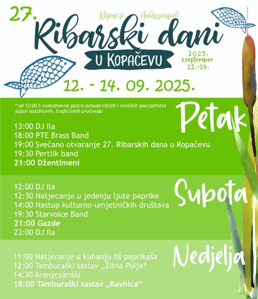 Kopačevo će od 12. do 14. rujna ponovno biti domaćin tradicionalnih Ribarskih dana, manifestacije koja već gotovo tri desetljeća privlači posjetitelje iz cijele regije.