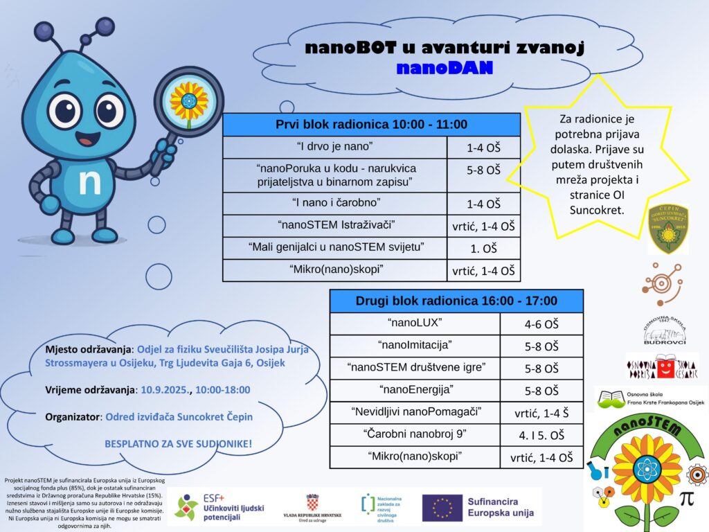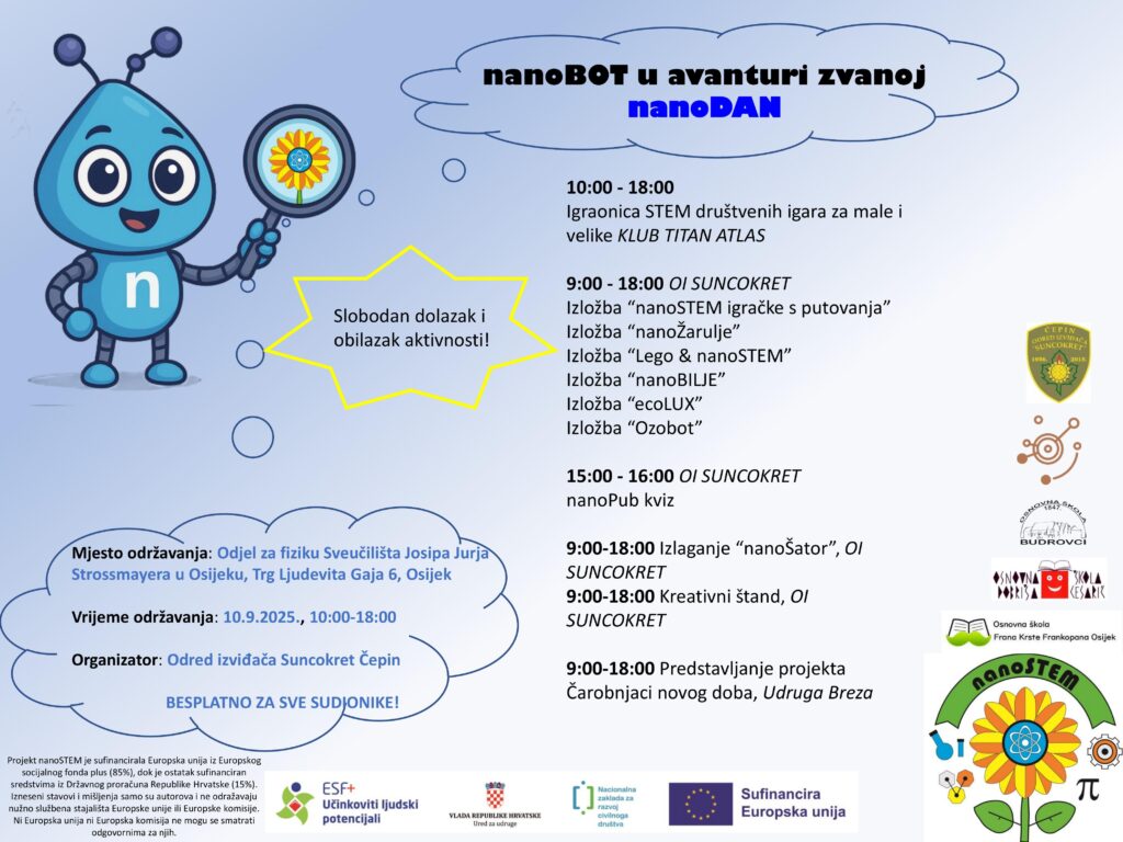 U srijedu, 10. rujna 2025. godine, na Odjelu za fiziku Sveučilišta Josipa Jurja Strossmayera u Osijeku održat će se manifestacija pod nazivom nanoDAN – dan znanosti, kreativnosti i otkrivanja čudesnog svijeta nanotehnologije.