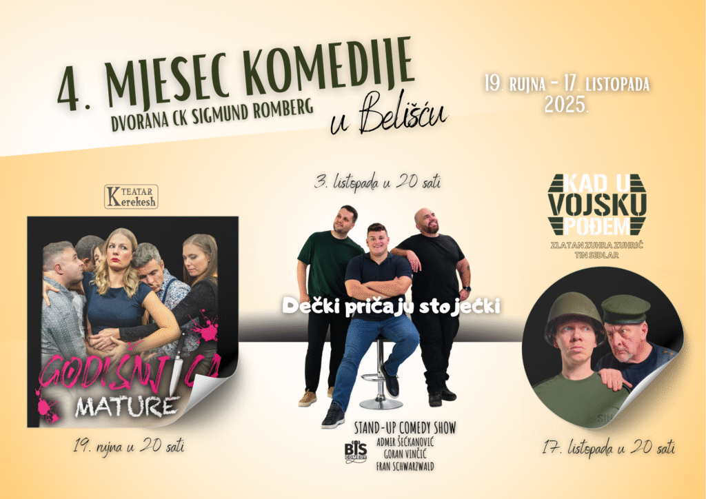Centar za kulturu “Sigmund Romberg” najavljuje četvrti Mjesec komedije u Belišću. Riječ je o festivalu smijeha koji će i ove godine na belišćanskim kazališnim daskama ugostiti tri fantastične komedije u izvedbi poznatih hrvatskih kazališta te poznatih lica hrvatske glumačke scene.