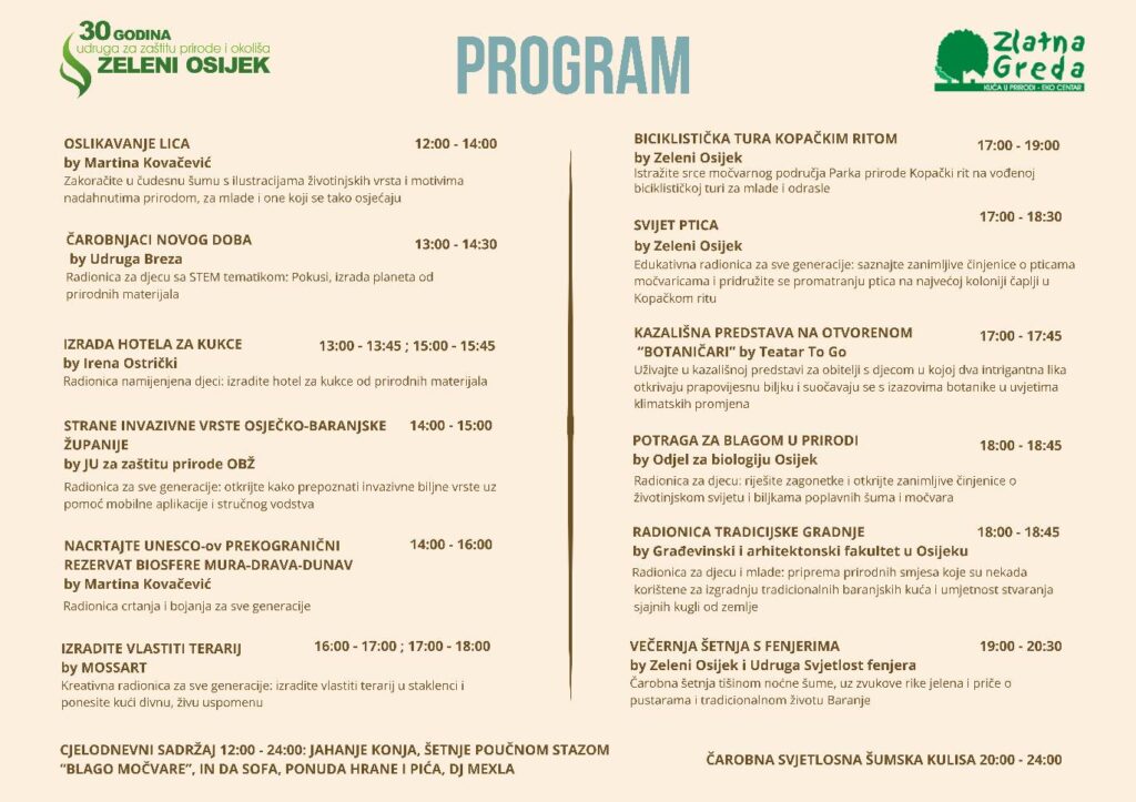 Festival za rekreativce, izletnike, ljubitelje prirode i obitelji s djecom poziva vas u svoj dnevni boravak na otvorenom, okružen zelenilom i rođendanskim vibracijama – Udruga Zeleni Osijek poziva vas da proslavite s njima 30 godina predanog rada u području zaštite prirode i okoliša te provedete nezaboravan dan u prirodi!