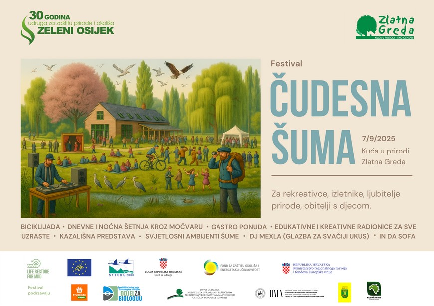 Pripremite dekice, društvo i dobro raspoloženje jer vas ove nedjelje, 7. rujna 2025., od 12 sati pa sve do ponoći u Kući u prirodi Zlatna Greda čeka još jedna Čudesna šuma! Festival u organizaciji Udruge Zeleni Osijek donosi spoj aktivnog boravka i odmora u prirodi, umjetnosti, edukacije i odlične zabave u samom srcu „Europske Amazone“.