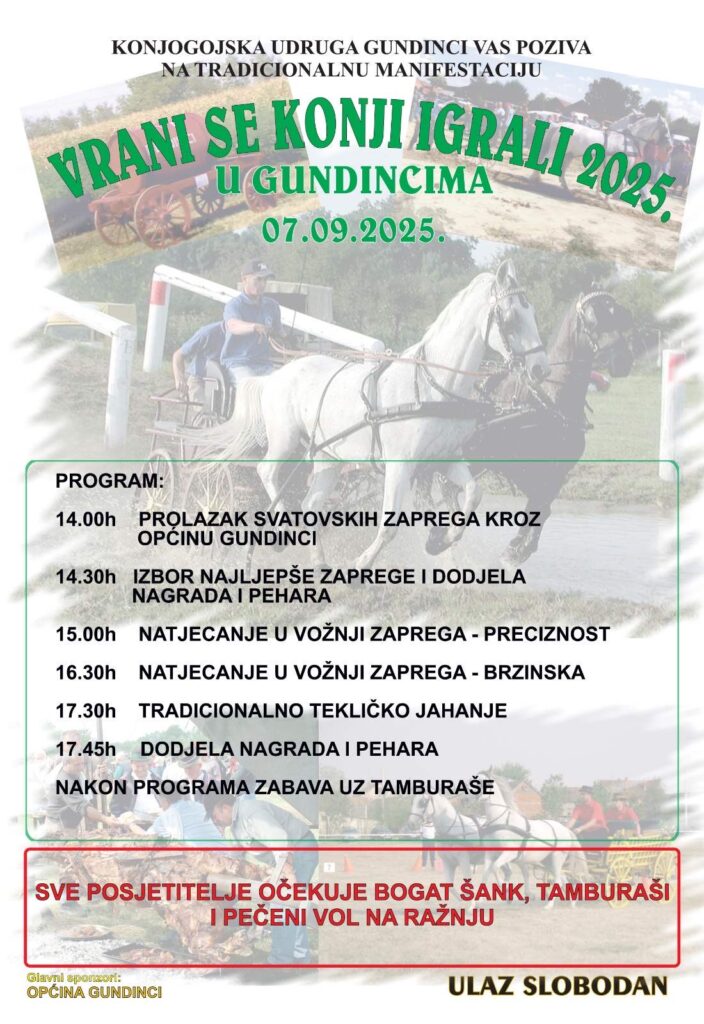 Konjogojska udruga Gundinci poziva sve ljubitelje konja, tradicije i dobre zabave na već tradicionalnu manifestaciju “Vrani se konji igrali”, koja će se održati u nedjelju, 7. rujna 2025. godine u Gundincima.
