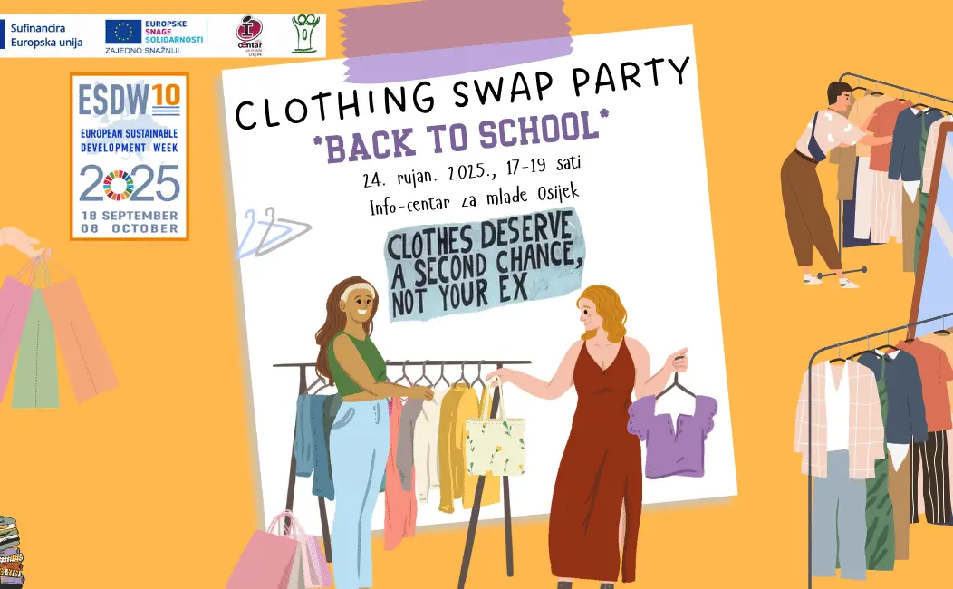 Clothing swap će se održati u srijedu 24. rujna 2025. od 17 do 19 sati u Info centru za mlade Osijek (Kralja Zvonimira 15). Ovo je već treći po redu clothing swap ove godine jer su upravo mladi tražili.
