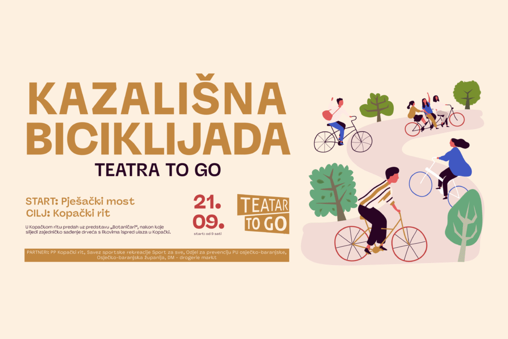 Teatar To Go najavljuje Kazališnu biciklijadu na relaciji od Osijeka do Kopačkog rita, 21. rujna 2025. Na ciljanoj lokaciji igrat će se predstava za djecu “Botaničari”, nakon čega slijedi sadnja drveća u Kopačkom ritu.