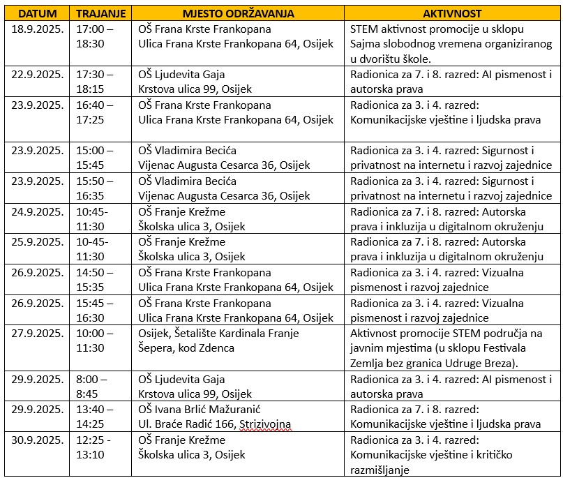 Radionice se provode kroz projekt „STEMpo – Ritam zajednice: Digitalne kompetencije za humani razvoj“ u sljedećim osječkim školama: OŠ Frana Krste Frankopana, OŠ Franje Krežme, OŠ Ljudevita Gaja, OŠ Vladimira Becića te u OŠ Hinka Juhna u Podgoraču i OŠ Ivana Brlić Mažuranić u Strizivojni.