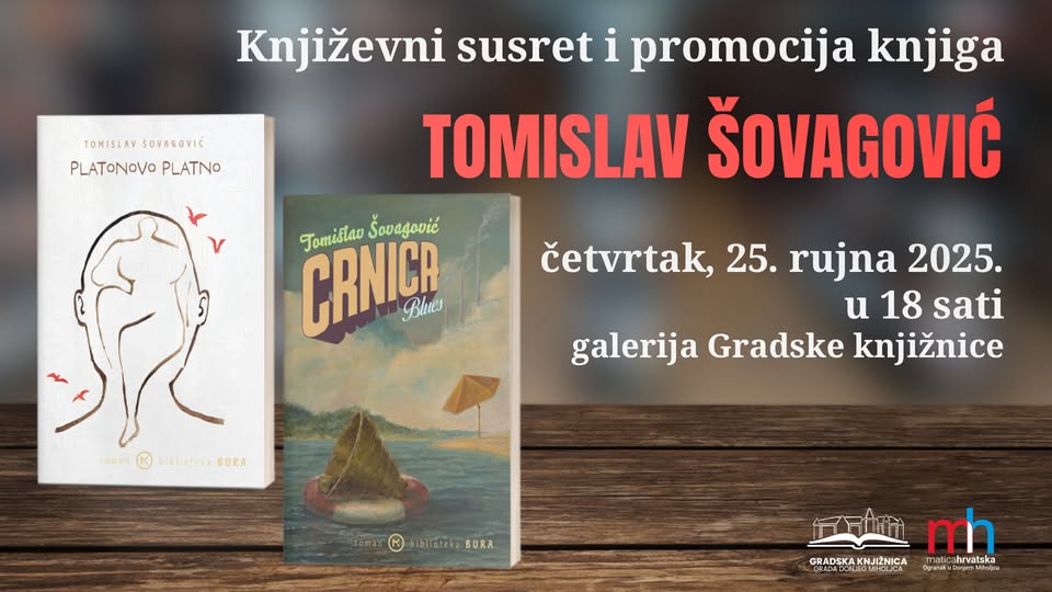 U suradnji s Gradskom knjižnicom grada Donjega Miholjca 25. rujna 2025. god. u 18 sati na galeriji knjižnice Ogranak Matice hrvatske u Donjem Miholjcu ponovno ugošćuje Tomislava Šovagovića s njegovim novim romanima “Platonovo platno” i “Crnica blues”.