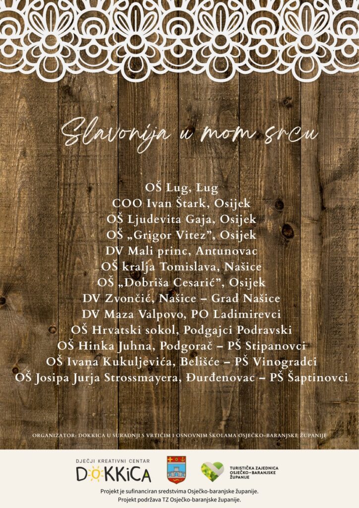 Upravo zato se Dječji kreativni centar DOKKICA odlučilo pridružiti obilježavanju kroz projekt „Slavonija u mom srcu”, koji je okupio 13 ustanova iz 9 slavonskih gradova i mjesta te povezao 25 odgojno-obrazovnih djelatnika, više od 230 djece i oko 100 roditelja. U ustanovama – sudionicama projekta mentorice su zajedno s djecom, roditeljima i mentoricama istraživali, čuvali i predstavljali bogatstvo slavonskih običaja. Kroz radionice, kreativne aktivnosti i uređenje Kutaka slavonske baštine u ustanovama, naglasili su koliko je važno da tradicija živi i u svakodnevnom životu mladih generacija.