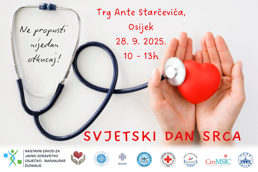 Nastavni zavod za javno zdravstvo Osječko-baranjske županije, Udruga kardiovaskularnih bolesnika Osijek, Zavod za bolesti srca i krvnih žila Kliničkog bolničkog centra Osijek, Dom zdravlja Osječko-baranjske županije, Medicinska škola Osijek, Gradsko društvo Crvenog križa Osijek, Gradski savez za sportsku rekreaciju “Sport za sve” Osijek i CroMSIC udruga Medicinskog fakulteta Osijek obilježit će Svjetski dan srca u nedjelju 28. rujna u Osijeku, na Trgu Ante Starčevića, od 10 do 13 sati.