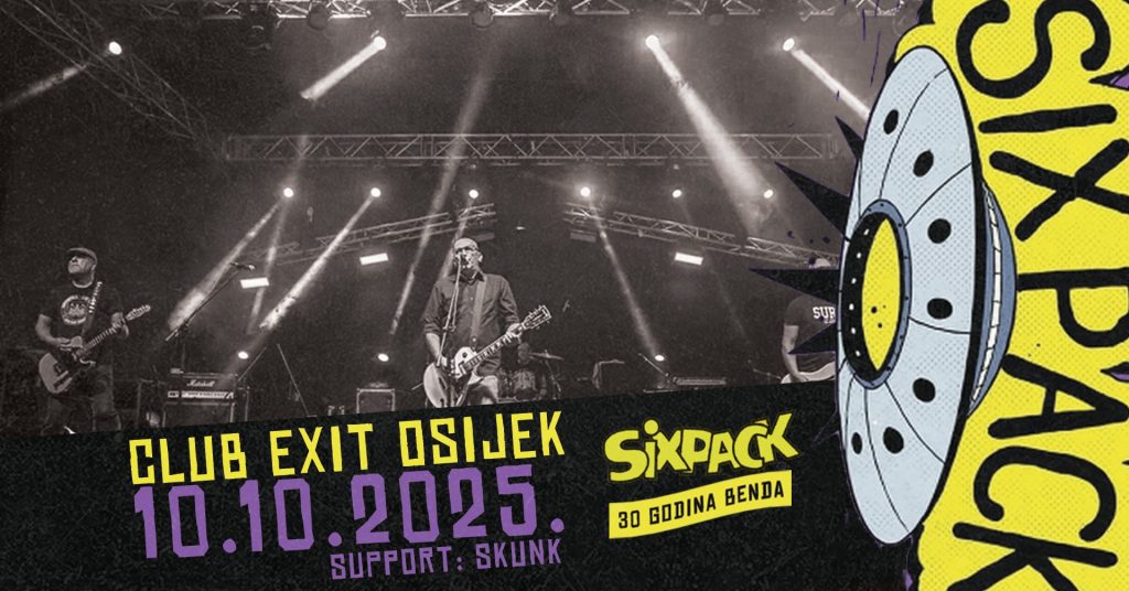 Osječki klub najavljuje otvorenje nove koncertne sezone uz nastup legendarnog srpskog punk-rock benda Six Pack, koji na sceni traje već više od tri desetljeća. Kao predgrupa nastupit će čepinski punk sastav Skunk.