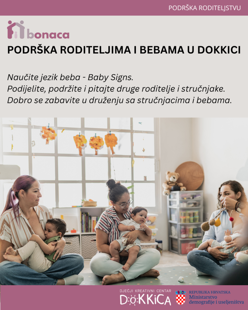 Dječji kreativni centar DOKKICA u okviru projekta „Bonaca – postpartalna podrška roditeljima“ provodi grupe podrške za trudnice i roditelje beba. Cilj programa je pružiti stručnu i sveobuhvatnu podršku roditeljima u prvim mjesecima roditeljstva.