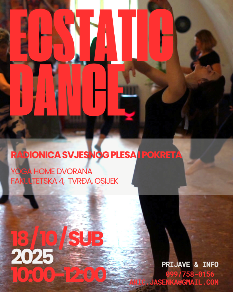 Ecstatic dance je oblik meditacije u pokretu, gdje se prepuštamo plesu vođeni posebno odabranom glazbom. Plešemo slobodno, bosi i svjesni, bez alkohola, droga i mobitela. Tijekom plesa komuniciramo samo pokretom, bez razgovora.