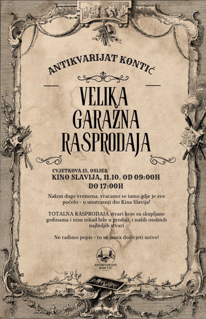 Nakon duže pauze, u subotu 11. listopada 2025. održat će se velika garažna rasprodaja u unutarnjem dijelu Kina Slavija, na adresi Cvjetkova 15 u osječkom Donjem gradu. Rasprodaja će trajati od 9 do 17 sati.