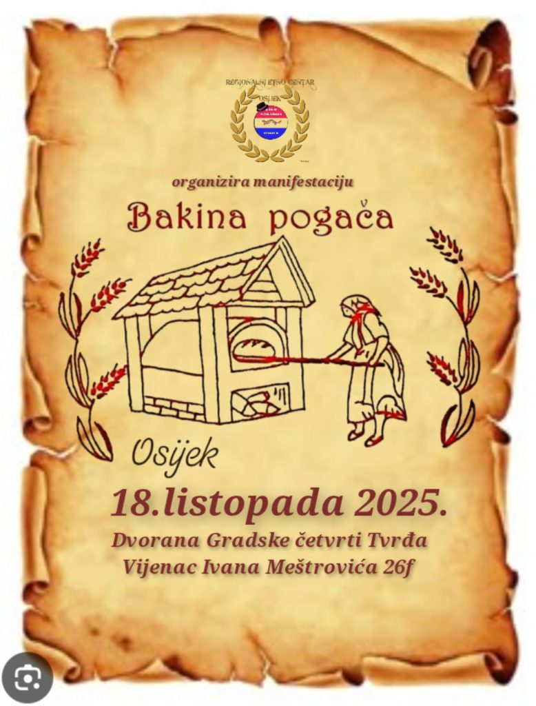 U subotu 18.10., u dvorani Gradske četvrti Tvrđa na Vijencu Ivana Meštrovića 26f sa početkom u 16 sati održava tradicionalna gastro manifestacija “Bakina pogača Osijek”.