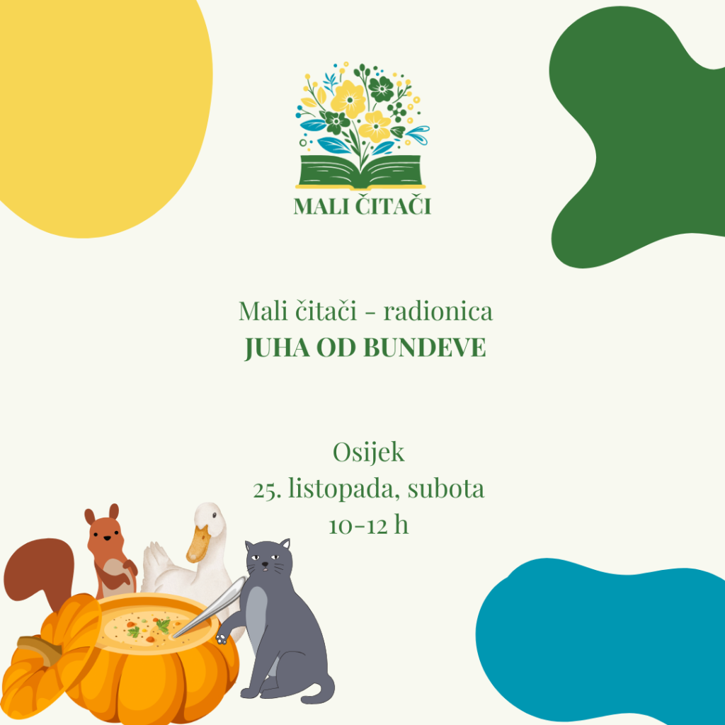 U subotu, 25. listopada 2025., od 10 do 12 sati, u Tajnom vrtu Malih čitača održat će se jesenska tematska radionica za djecu pod nazivom „Juha od bundeve“, inspirirana istoimenom slikovnicom britanske autorice Helen Cooper.