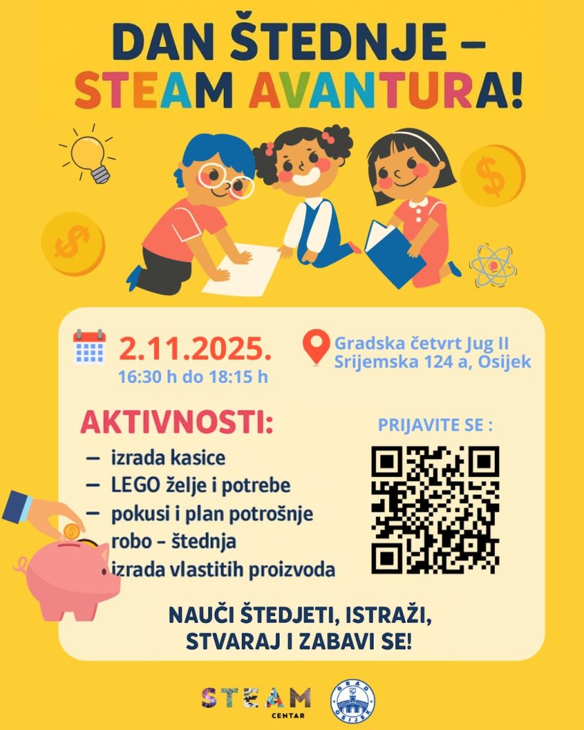Udruga STEAM centar u nedjelju, 2. studenog 2025. godine, organizira besplatne STEAM radionice za djecu povodom obilježavanja Dana štednje, a u sklopu projekta “STEAMonomija – projekt razvijanja financijske pismenosti djece kroz STEAM aktivnosti“ kojeg financira Grad Osijek.
