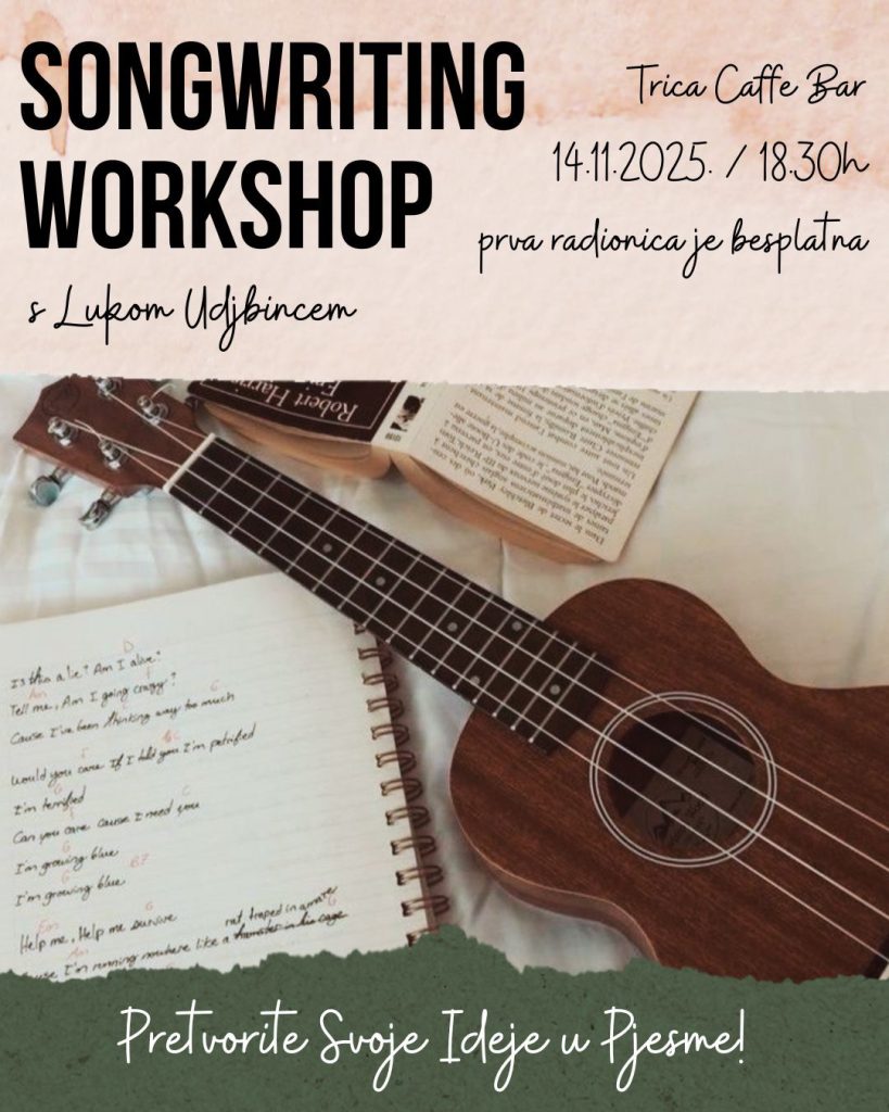 Želite li naučiti kako napisati pjesmu od početka do kraja? Imate li ideje za tekstove i melodije, ali ne znate kako ih strukturirati u cjelovitu glazbenu priču? Pridružite nam se ovog petka 14.11.2025. u 18.30h na intenzivnoj „Songwriting“ radionici koju vodi Luka Udjbinac, višestruko nagrađivani multi-instrumentalist i magistar jazz kompozicije koji je do sada napisao više od 5.000 minuta glazbe.