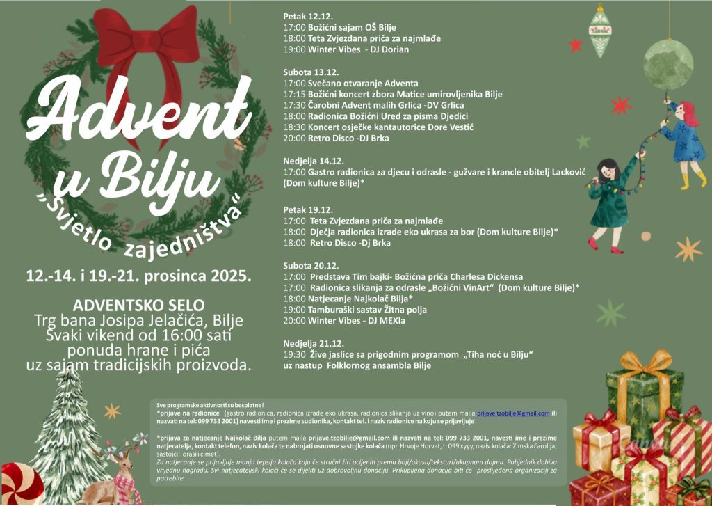 Advent u Bilju ove godine donosi bogat program za sve generacije, uključujući sajmove, radionice, koncerte i predstave. Program se održava na Trgu bana Josipa Jelačića, a svake subote i nedjelje od 16:00 sati nudi se i bogata ponuda hrane i pića uz sajam tradicijskih proizvoda.