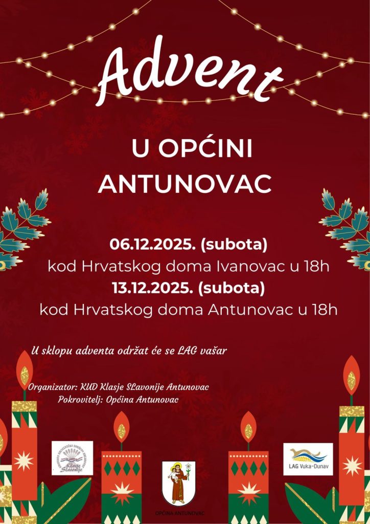 Tradicionalno, i ove godine KUD “Klasje Slavonije” organizira Advent u Općini Antunovac uz veliku podršku Općine Antunovac.