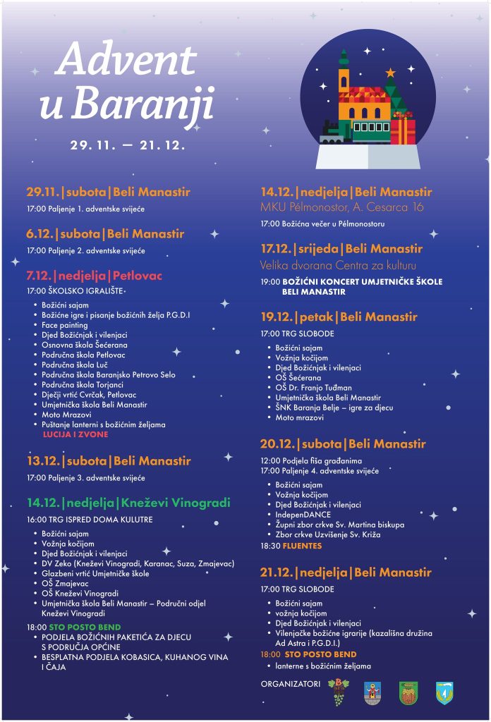 Program započinje u subotu, 29. studenoga, u Belom Manastiru, gdje će u 17 sati biti upaljena prva adventska svijeća. Druga adventska svijeća bit će upaljena u subotu, 6. prosinca, također u 17 sati na istome mjestu.