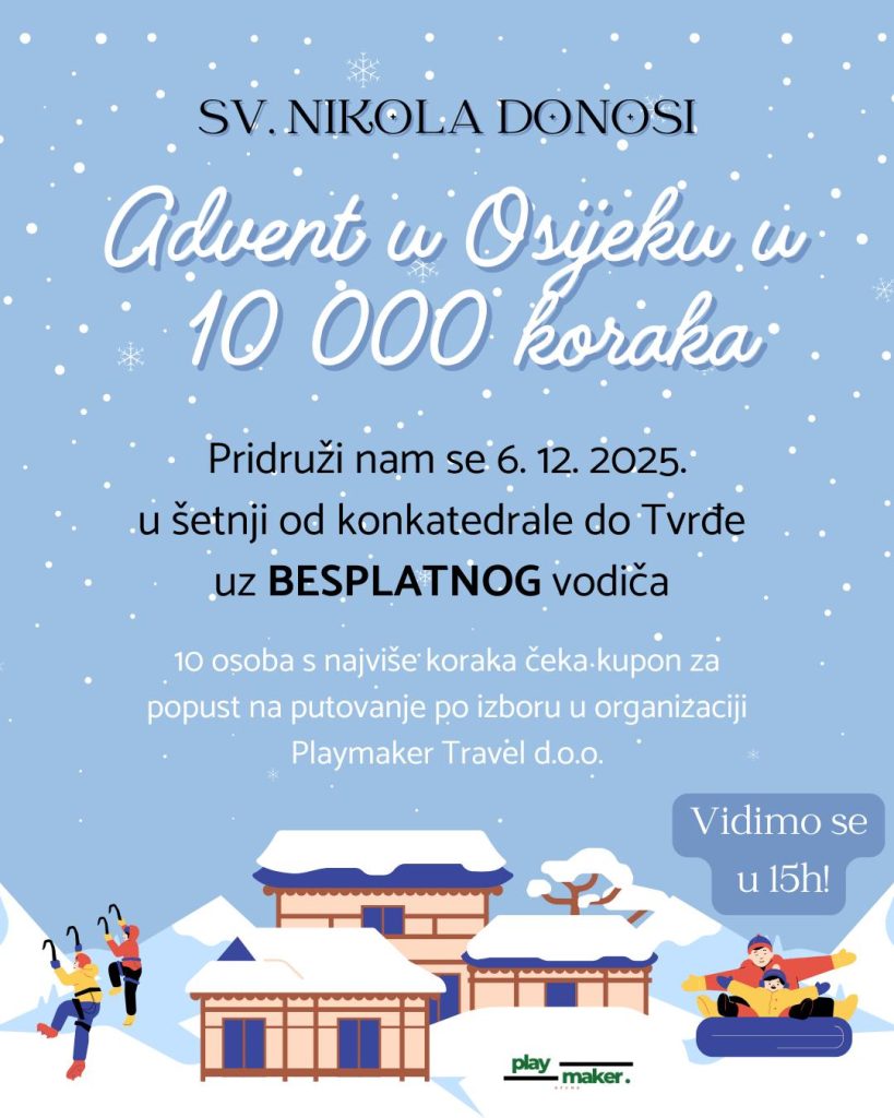 Pridruži se u posebnoj adventskoj šetnji kroz Osijek! Kroz 10.000 koraka vodi nas BESPLATNI turistički vodič koji će otkriti skrivene priče, zanimljivosti i čaroliju grada u blagdanskom ruhu.