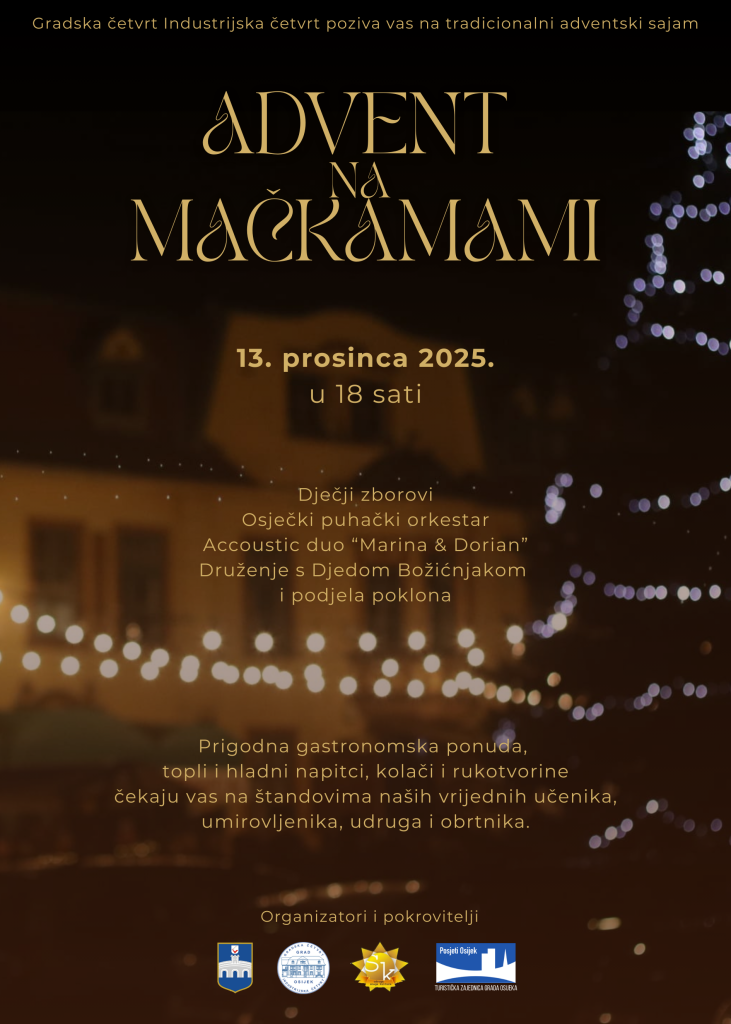Gradska četvrt Industrijska četvrt pod pokroviteljstvom Grada Osijeka i ove godine organizira tradicionalni Advent na Mačkamami, koji će se održati 13. prosinca 2025. u 18 sati.