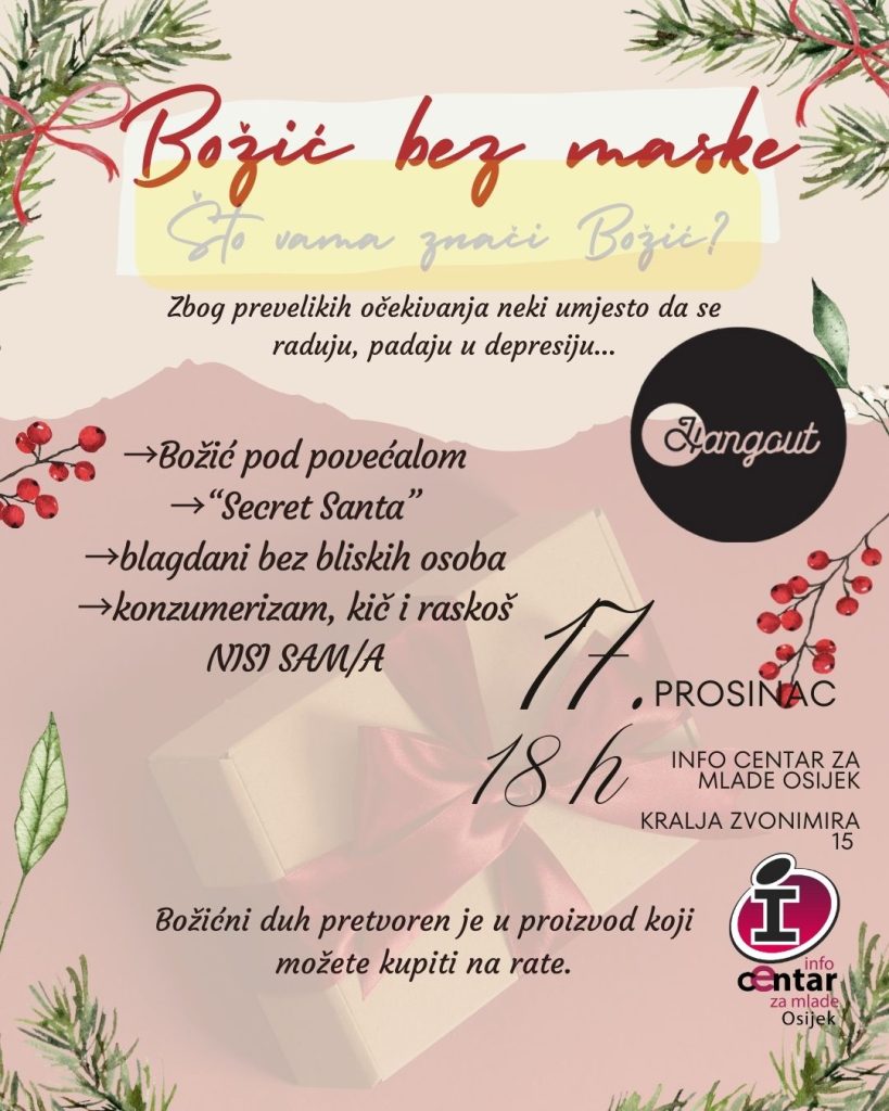 Hangout će se održati u Info-centru za mlade u Ulici kralja Zvonimira 15, Osijek, 17. prosinca 2025., u 18:00 sati. Kako bismo lakše organizirali susret, kratko najavite svoj dolazak putem prijavnice. Dođite, ponesite svoj skromni darak, ali od srca, te uz šalicu čaja ili kave i otvoren razgovor potaknimo topliji, empatičniji i manje potrošački pristup blagdanima.