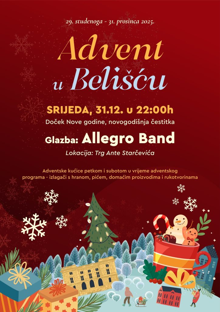 U srijedu 31.12. s početkom u 22:00 sata započinje program dočeka Nove godine u adventskom prostoru na Trgu Ante Starčevića u Belišću.