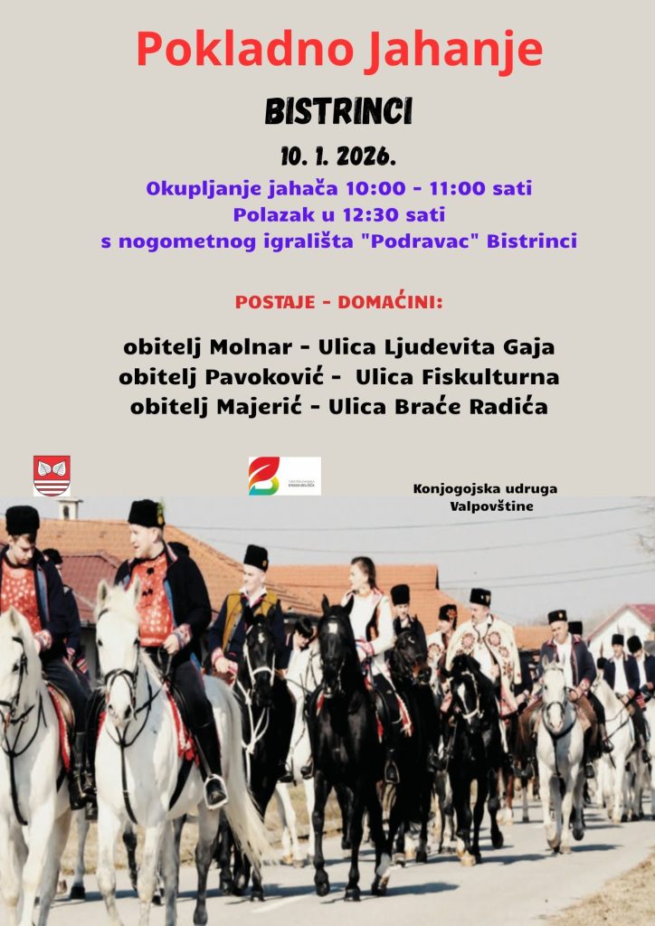 U subotu, 10. siječnja 2026. godine jahači će krenuti u 12:30 sati s nogometnog igrališta NK Podravac u Bistrincima te će, prateći rutu kroz mjesto, obići tri postaje.