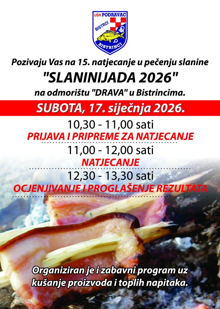 UŠR Podravac Bistrinci poziva na 15. natjecanje u pečenju slanine – Slaninijadu 2026, koje će se održati na odmorištu “Drava“ u Bistrincima u subotu, 17. siječnja 2026. godine.