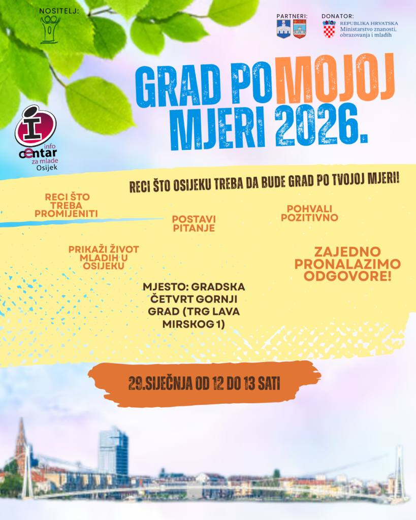 Voliš Osijek i želiš grad u kojem mladi nisu samo promatrači, nego žele preuzeti odgovornost i pokrenuti promjene? Gdje mladi biraju sudjelovati, predlagati i stvarati prilike za sebe i druge – otvaraju prostore za druženje, kreativnost, glazbu i razmjenu ideja. Grad u kojem se glas mladih uvažava – i u kojem upravo tvoje mišljenje može biti početak novih iskoraka. Reci što je u njemu dobro, što bi moglo biti bolje? Što treba unaprijediti, a što pohvaliti?