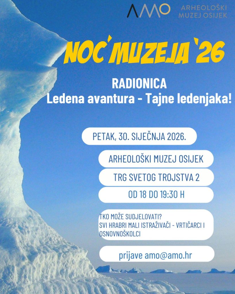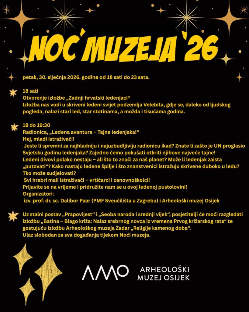U manifestaciju “Noć muzeja” koja se održava u petak, 30. siječnja 2026. godine, od 18 do 23 sata, Arheološki muzej Osijek i ove se godine uključuje bogatim i raznolikim programom za sve uzraste. Muzej će svoja vrata otvoriti u 18 sati te će do kasnih večernjih sati biti dostupan svim zainteresiranim posjetiteljima.