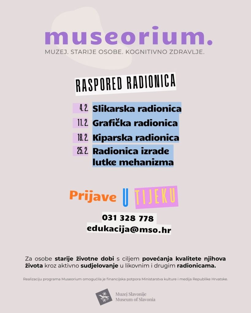 Muzej Slavonije nastavlja s programom Museorium – ciklusom likovnih i baštinskih radionica namijenjenim osobama starije životne dobi (60+) koje žele ostati aktivne, kreativne i uključene u kulturni život zajednice.