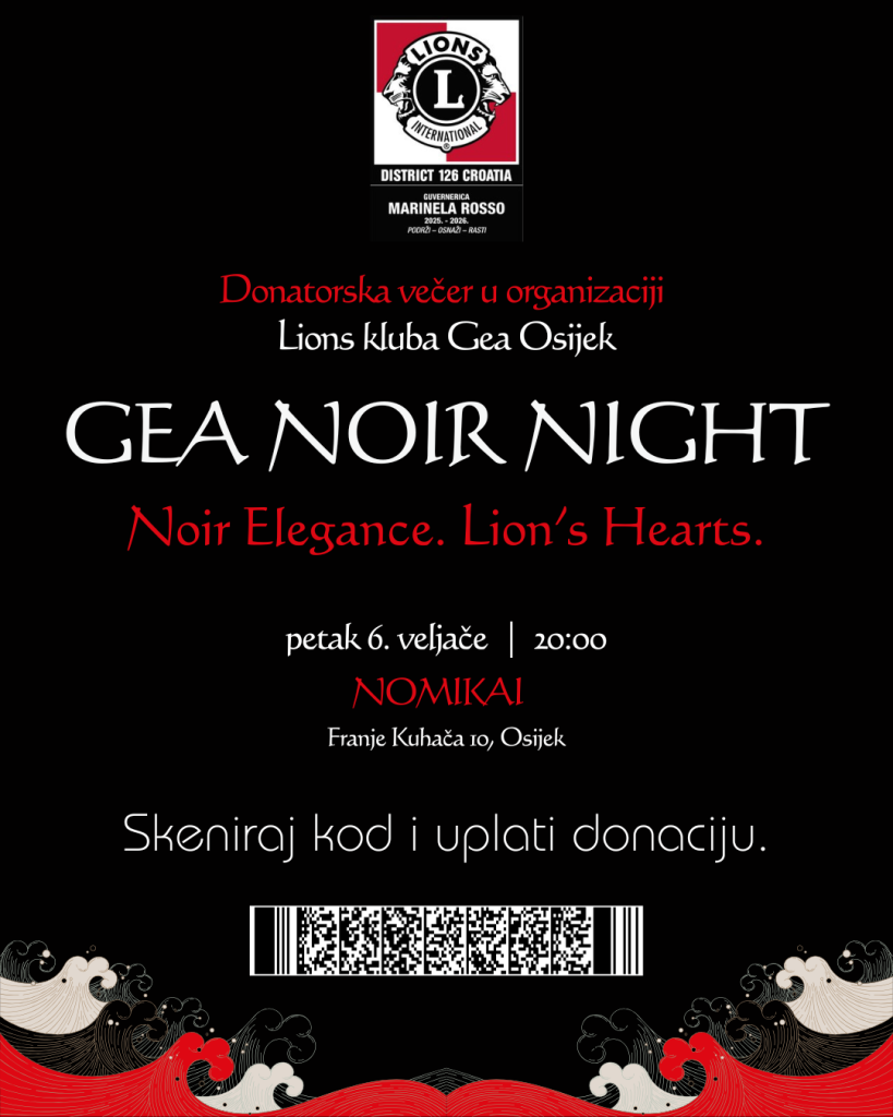 Lions klub Gea Osijek organizira donatorsku večer Gea Noir Night, koja će se održati u petak, 6. veljače 2026. godine u prostoru Nomikai bara u Osijeku, s početkom u 20 sati.