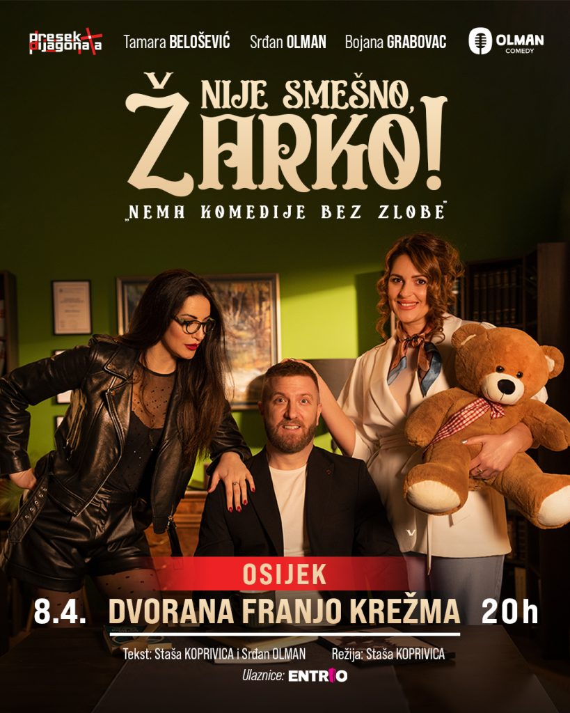 Komedija “Nije smešno, Žarko!“ gostuje u Osijeku 8. travnja u 20 sati u Dvorani Franjo Krežma. Riječ je o predstavi koja spaja stand-up i komičnu dramu, donoseći više od sat vremena zabave, ali i ozbiljnih tema.