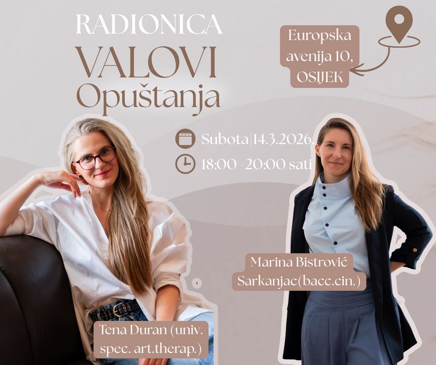 Radionica opuštanja pod nazivom “Valovi opuštanja“, koja uključuje elemente muzikoterapije, svjesnog disanja i kreativnog izražavanja, održat će se u organizaciji Zen Fita, na čelu s Marinom Bistrović Sarkanjac i Tenom Duran. Ova radionica osmišljena je kao prostor predaha i regeneracije, nježan odmak od svakodnevnih obaveza te prilika za ponovno uspostavljanje unutarnje ravnoteže.