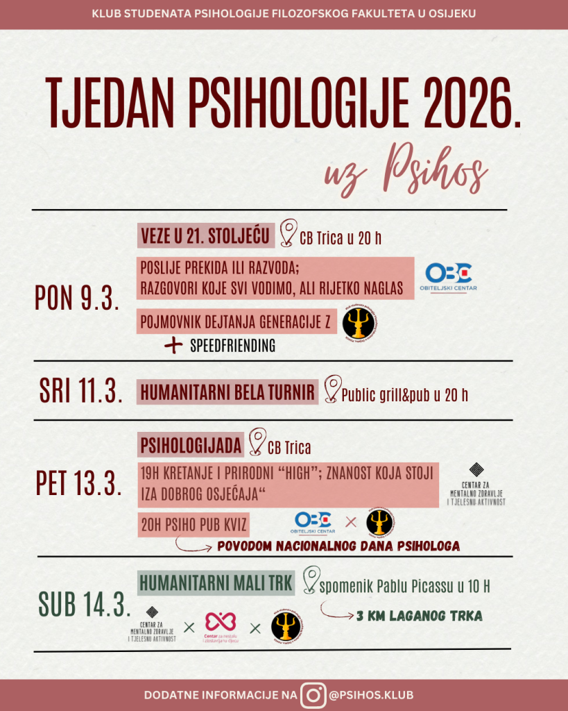 I ove godine Klub studenata psihologije Psihos obilježava Tjedan psihologije. Prvi događaj održat će se 9.3. u 19 sati u Caffe baru Trica, a tema večeri bit će veze u 21. stoljeću. Kroz predavanje “Pojmovnik dejtanja generacije Z“ studentice Mia Pucić i Dora Vuković predstavit će dejtanje svoje generacije, dok će psihologinja Sarah Sarić, ujedno zaposlenica Obiteljskog centra, održati predavanje “Poslije razvoda ili prekida – razgovori koje svi vodimo, ali rijetko naglas“. Nakon zanimljivih i korisnih predavanja, za sve zainteresirane uslijedit će speedfriending koji je savršena prilika za upoznavanje novih ljudi i razmjenu iskustava.