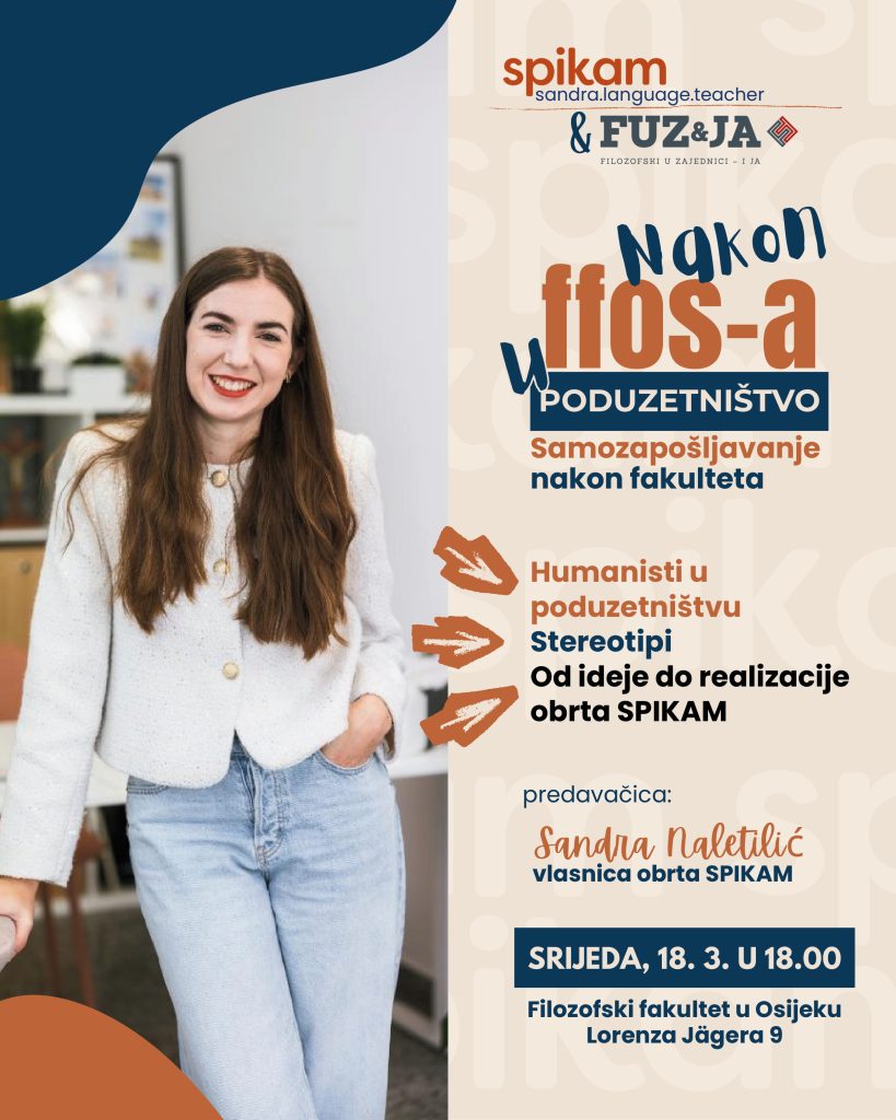 U okviru predavanja predstavit će svoj put od studentske ideje do konkretne realizacije obrta i osvrnuti se na stereotipe koji često prate humanističke studije